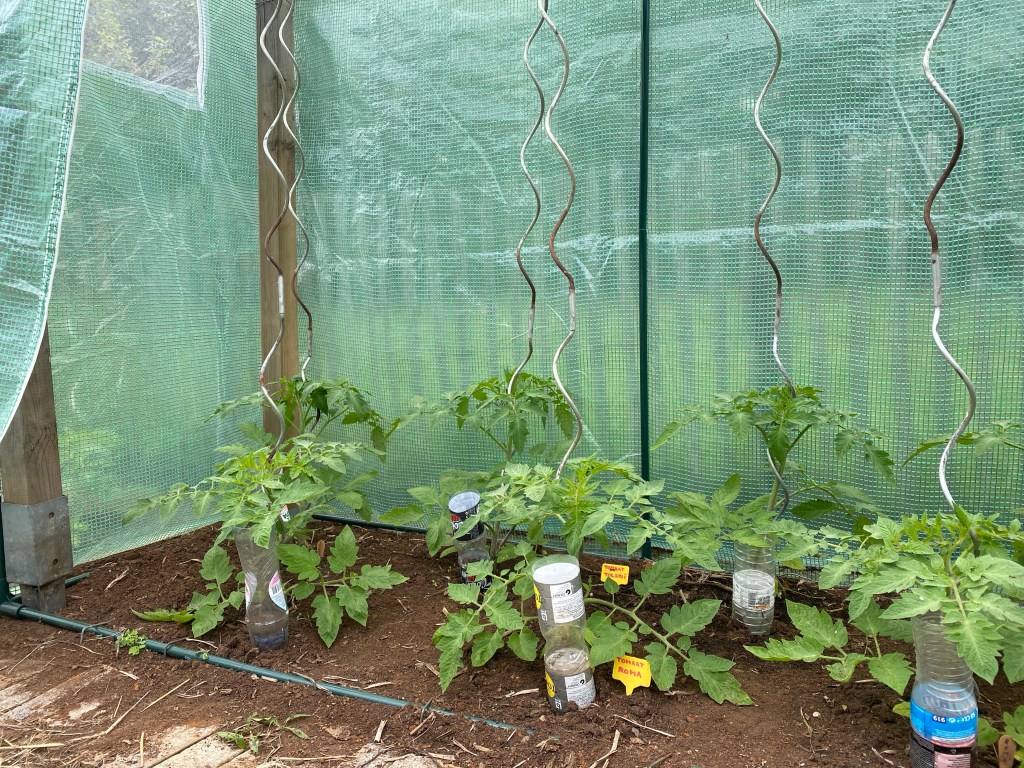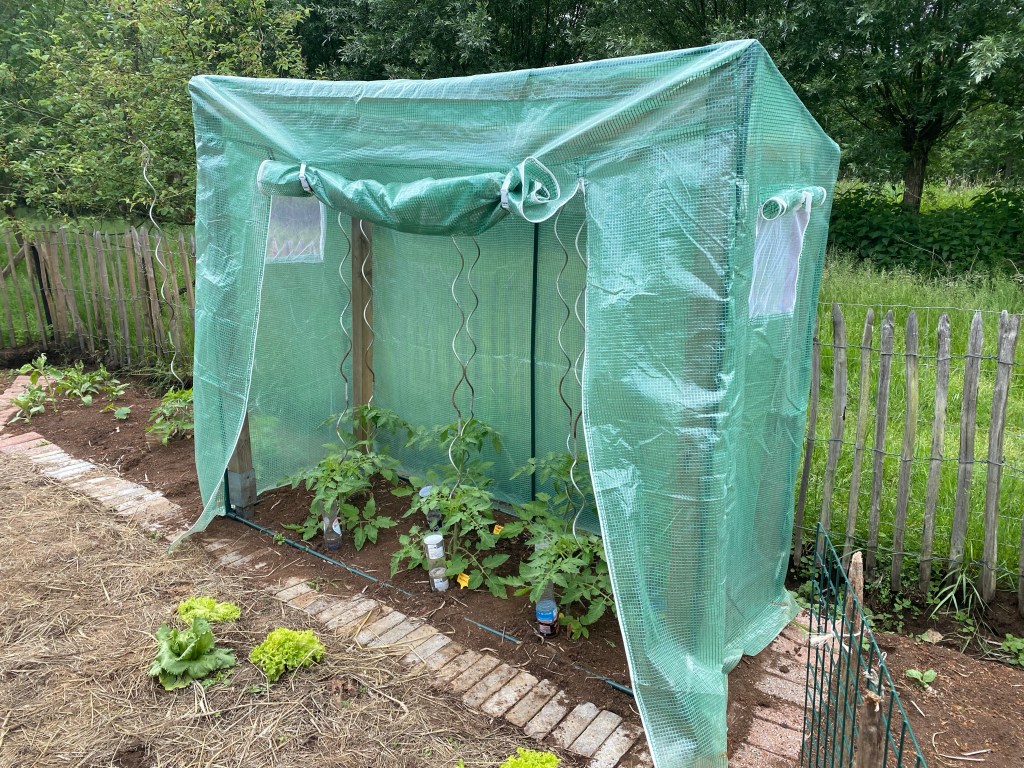Voor de tomaten had ik een simpel serretje gekocht. Helaas is goedkoop vaak duurkoop. De voorbije regenbui zorgde voor een zwaar gewicht aan water op het dak waardoor het buizenframe zich samen plooide. Een kleine aanpassing moet dit in de toekomst voorkomen. Met enkele balken heb ik een steviger binnenframe gemaakt.