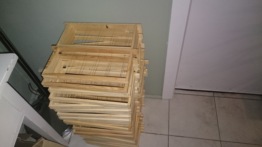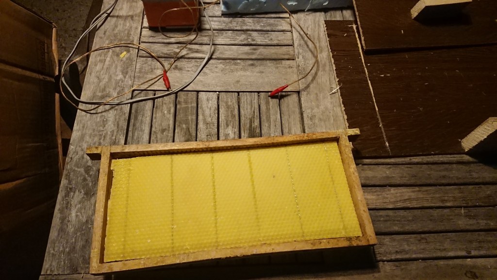 Vermits ik elk jaar 75% van mijn Kempische honingramen vervang door nieuwe waswafels, ben ik alvast begonnen aan het klaarmaken van de eerste partij. Begin april krijgen alle bijenvolken een eerste honingbak. Deze bevat 12 ramen en in het midden hang ik zes uitgewerkte ramen van vorig jaar. Deze uitgewerkte ramen werden bewaard in afgesloten plastic bakken en ze werden behandeld met azijnzuur tegen de wasmot. Door gebruik te maken van enkele uitgewerkte ramen, kruipen de bijen sneller door het koninginnenrooster naar de honingbak. Zodra ze beginnen met het vullen van de raten met verse nectar zullen ze ook de waswafels beginnen uit te werken. De nieuwe waswafels hangen dus aan de zijkanten. Normaal vullen de bijen eerst de raten in het midden van de honingbak, boven het broednest.