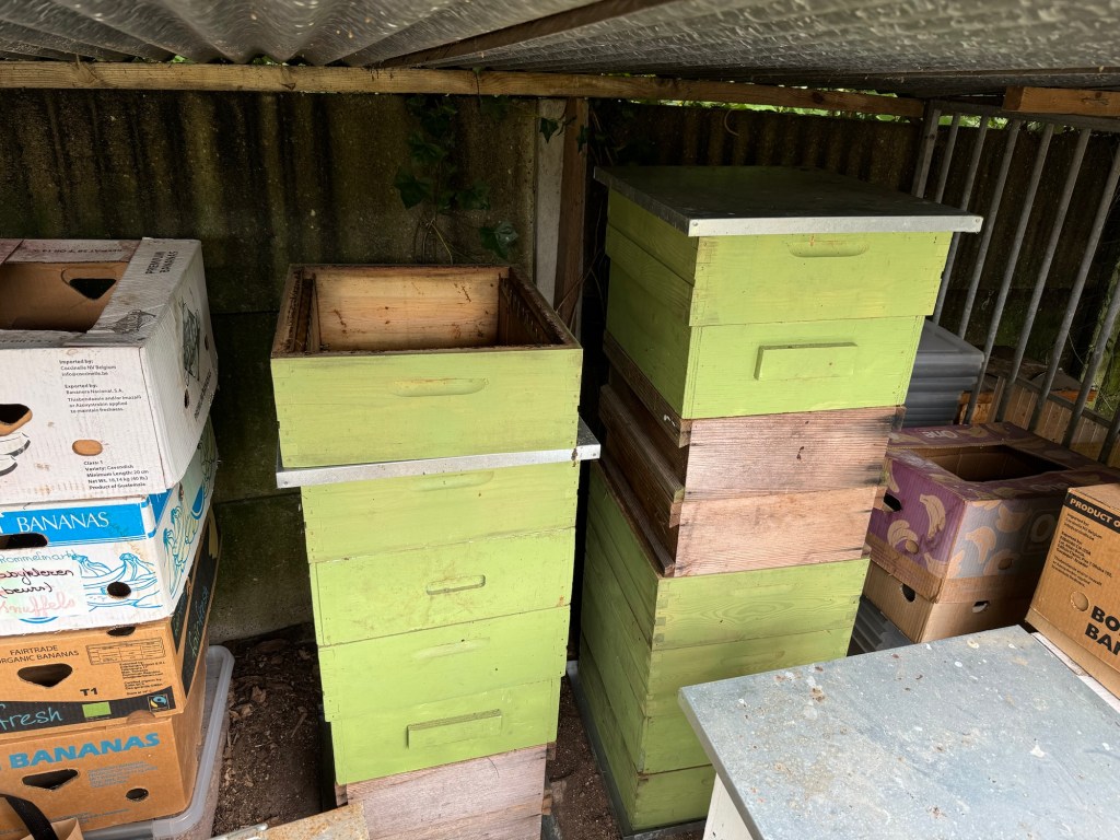 De leeggeslingerde ramen zijn drooggelikt op enkele bijenvolken en ik heb ze vandaag op torens gezet met azijnzuur. De honingkamers vol ramen zet ik op een toren met een lege honingkamer als bovenste. Hierin zet ik een schaaltje met een stukje spons. Ik giet daar dan azijnzuur op om traag maar zeker te verdampen. Hierdoor gaan de wasmotten het loodje leggen. Vermits de eitjes van de wasmot niet dood gaan, herhaal ik dit zodra al het azijnzuur is verdampt. De torens zijn zowel langs onder en boven volledig afgedicht met een metalen plaat.