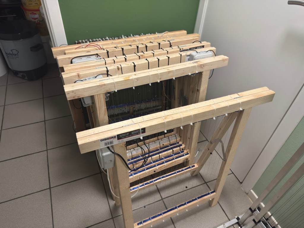 De hoornaarharpen zijn eveneens klaar. De vier die ik vorig jaar gebruikte op de eerste stand heb verbeterd. Het zonnepaneel van 200W met 2 batterijen was wel wat overkill, maar dat materiaal had ik nog liggen. Op de kleine stand met slechts twee volken had ik een stel gekochte harpen met accu en zonnepaneeltje van 50W dat zijn werk ook prima deed. Op de derde stand had ik vorig jaar mijn tenten gebruikt en hiervoor heb ik nu ook vijf harpen gemaakt.