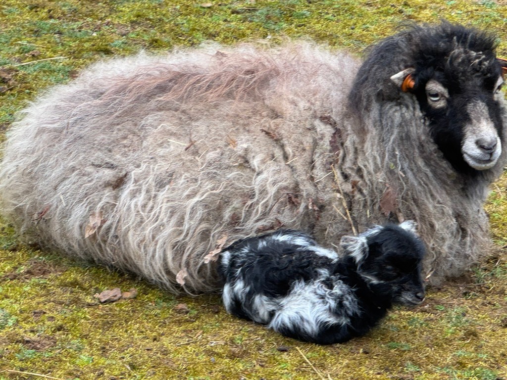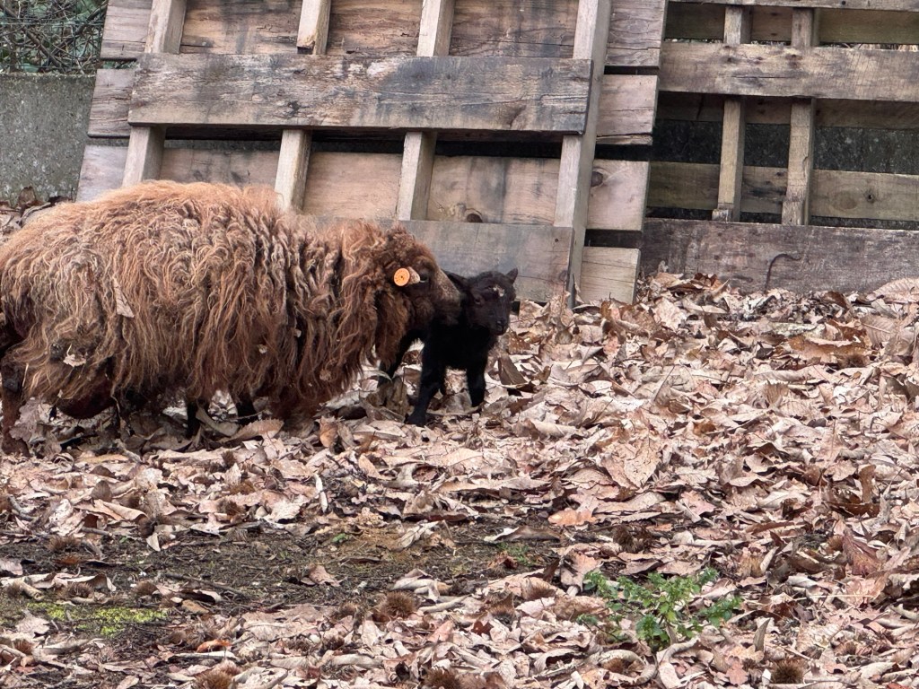 De zwarte ooi stond op stal en daar is het licht niet denderend. Het lammetje lijkt wel heel donkerbruin, neigend naar zwart. Foto maken was nu niet mogelijk.
