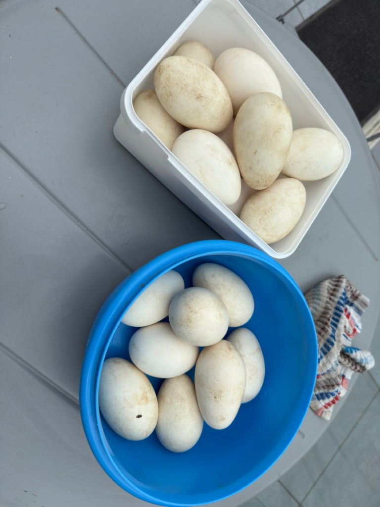 De ganzen leggen weer allemaal tezamen in 1 giga-nest. We hebben ze maar weggehaald want 20 eieren zonder broedsheid wordt alleen maar een stinkende kwestie. Laat de wafels dus maar komen!