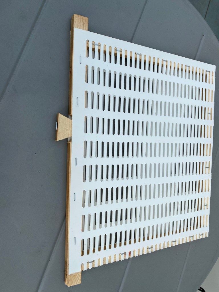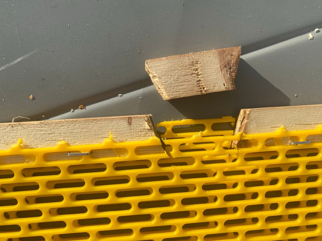 Na drie dagen, als de bijen de nieuwe ingang langs voor kennen, open ik de gaten langs de zijkanten. Hier kunnen de hoornaars binnen als ze op verkenning zijn. Langs achter kan de val dan als een schuif worden uitgehaald. Wordt wellicht vervolgd…