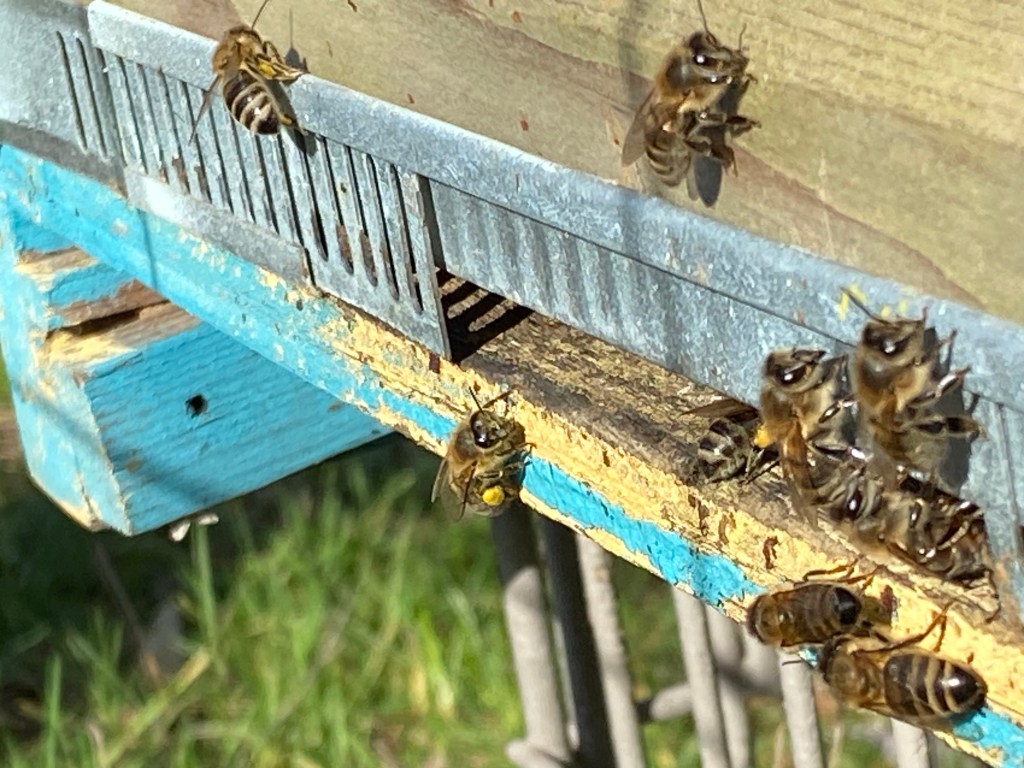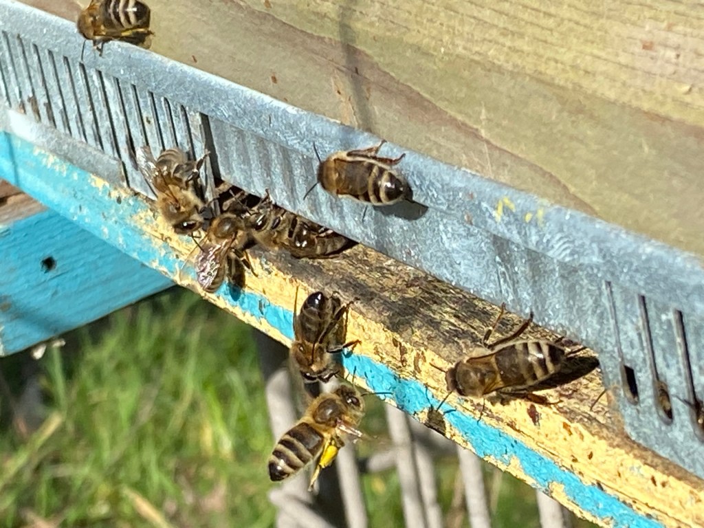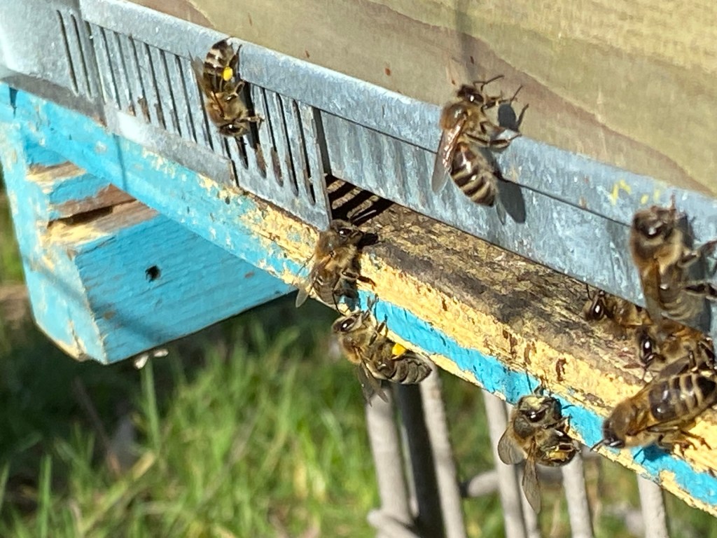 Vanmiddag 12 graden en het zonnetje schijnt recht op de vliegspleet van de bijenkasten. Dat is het moment voor een reinigingsvlucht. De bijen hebben nu eindelijk de mogelijkheid om even snel buiten te komen en hun lichaam te ‘reinigen’. Gedurende de winter, als de bijen in een dichte tros zitten, houden ze hun ontlasting op. Dit doen ze om hun woning zuiver te houden en zodoende ziektes te voorkomen. Maar nu ze even buiten kunnen, doen ze dit massaal.