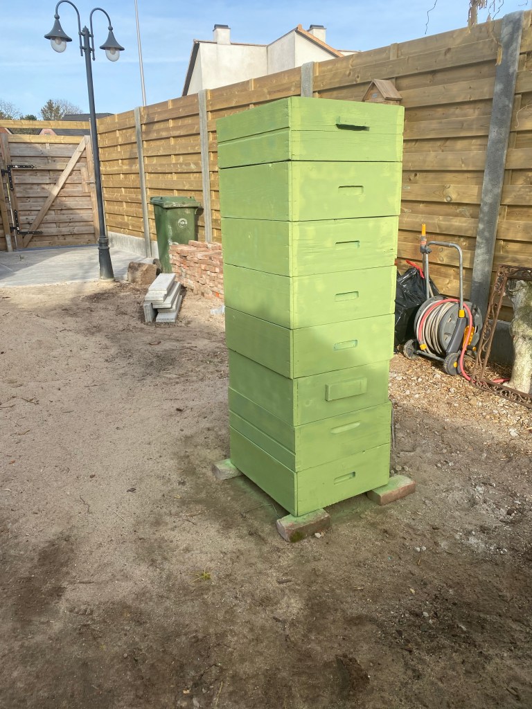 Ik heb spijtig genoeg vier kasten gevonden met uitsluitend darrenbroed. Deze worden volgende week nog opgeruimd. Enkele volken die ik als klein catalogeer, plaats ik morgen op elkaar. Ik zet nooit een zwak volk op een sterk. Het zou zo maar even het sterke volk kunnen ziek maken. Ik zet alleen twee zwakke volken op elkaar en hoop dan dat ze elkaar versterken en eind april op één broedbak kunnen. Er zal dan maar één koningin zijn en hopelijk voldoende broedramen om één bak te vullen. Ik geef ze in elk geval volgende week eveneens een honingbak.