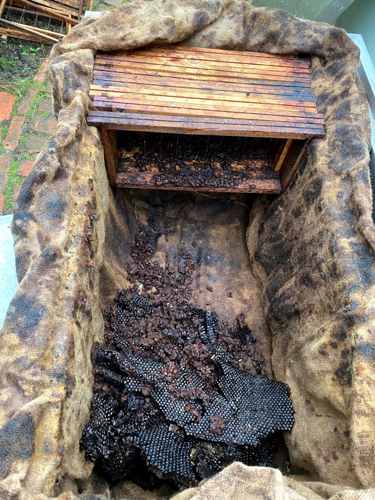 Op deze manier gaan wasmotten, hun eitjes en larven die eventueel meekomen al dood. Ik plaats ze daarna per 12 in een afgesloten container en stapel deze gewoon in de bijenhal.