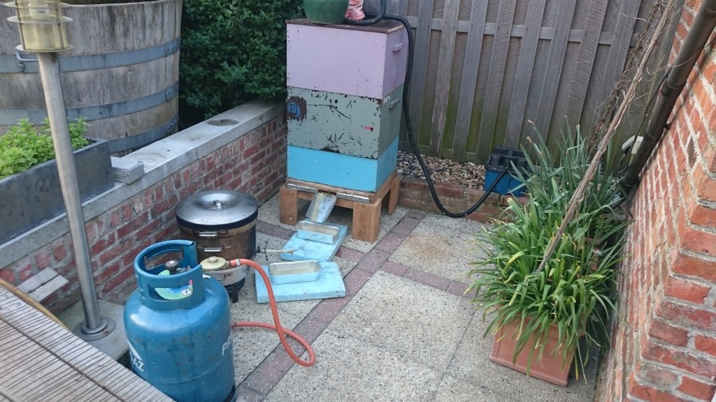 Van elk volk zet ik de broedbak even opzij. Op het omgekeerde deksel. Op de bodem zet ik dan een honingzolder met uitgeslingerde honingramen. Het vlieggat wordt nauw gezet tegen roverij. Slechts één tot twee bijenbreedte. Een nieuwe broedbak wordt leeg op de honingzolder gezet. Nu licht ik van de opzij gezette broedbak elk raam één voor één uit. De twee buitenste ramen, met stuifmeel en wat honing, worden in de nieuwe broedbak gehangen. Ze mogen absoluut geen broed bevatten. De opzittende bijen worden in een emmer afgeveegd. Ditzelfde doe ik nu met elk raam uit de oude broedbak. Deze ramen met broed, worden echter weggenomen om te worden gesmolten. Ik bewaar geen broed in broedtorens. Bijen heb ik voldoende op dat moment en oude bebroede ramen hebben ook geen enkele waarde. De nieuwe broedbak krijgt zo dus 10 nieuwe waswafels en de bijen in de emmer worden besproeid met het oxaalzuur alvorens ze in hun nieuwe broedbak te gieten. De jonge koningin kan, als ze dat wenst, dadelijk verder aan de leg op de onderste uitgeslingerde honingramen. Deze honingzolders zijn in het volgend voorjaar leeg en alle was wordt dan eveneens uitgesmolten. Indien ik twijfel over deze jonge koningin, zet ik een apideakastje boven op de broedbak. Hierin zit immers eveneens een jonge koningin van hetzelfde ‘supervolk’. Een voerbak boven op het volk maakt de situatie compleet. In de tweede helft van juli krijgt elk productievolk dus een proper geveegde bodem, een vernauwde vliegspleet tegen roverij, een honingzolder met uit te likken ramen die nog nooit zijn bebroed, tien waswafels op broedkamerformaat, een propere broedbak en een jonge koningin van een sterk volk. Ze zijn behandeld tegen de varroamijt met oxaalzuur tijdens een broedloze periode en ze krijgen een voerbak met suikersiroop. Slechts twee broedramen met wat stuifmeel en honing krijgen ze mee uit hun voorbije jaar.
