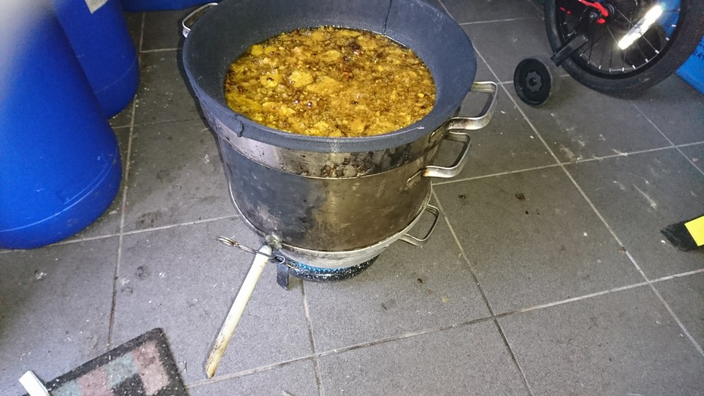 Zodra mijn laatste glazen bijna zijn verkocht, neem ik een emmer uit de kelder en zet hem gedurende anderhalve dag in een steriliseerketel bij 35 graden. De honing wordt dus au-bain-marie terug vloeibaar en kan dan worden ingepot. Elke emmer levert dan ongeveer dertig nieuwe potten vloeibare honing.