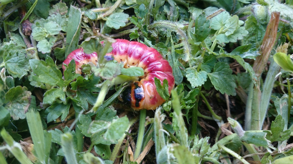 Vandaag een enorme rups gevonden, ca. 7cm en een intens rode kleur.