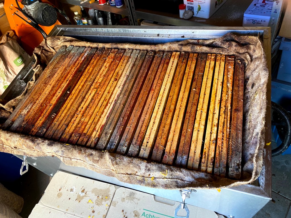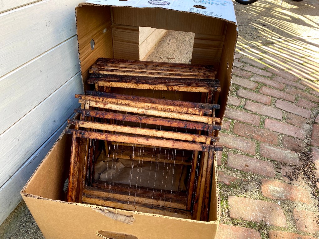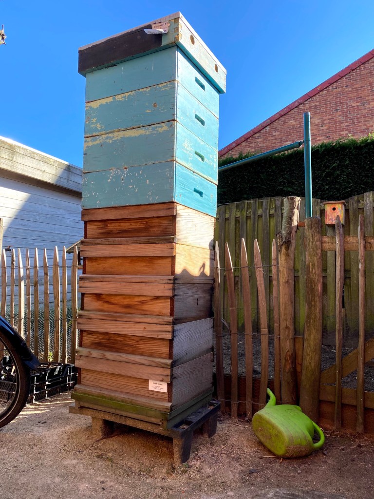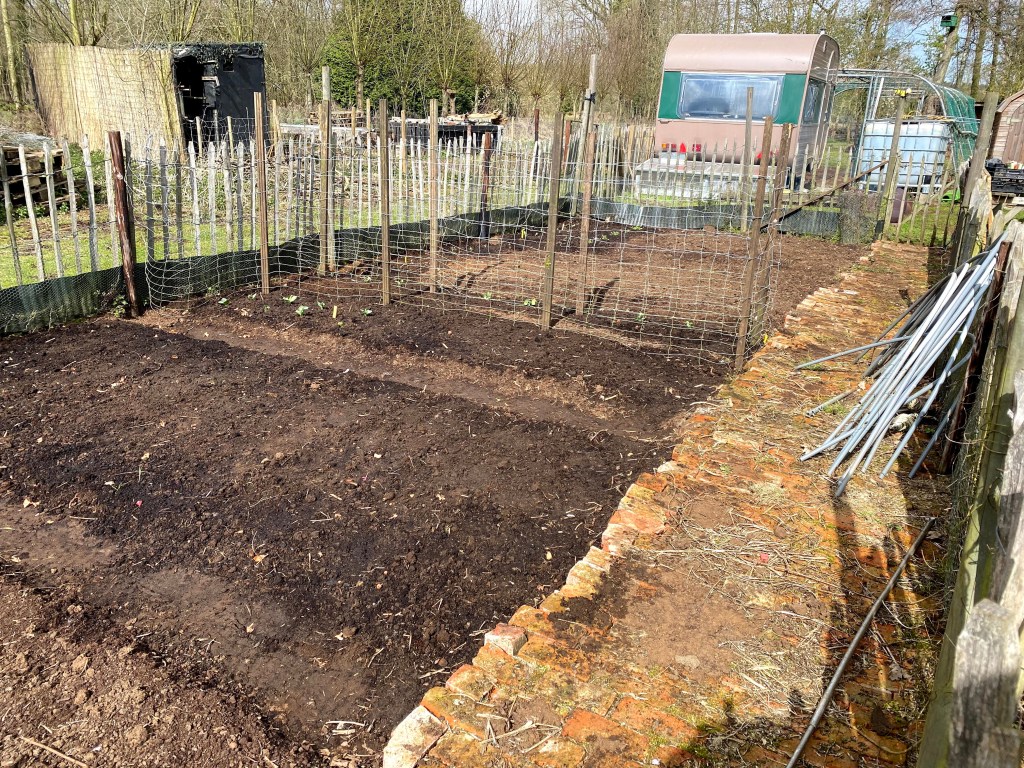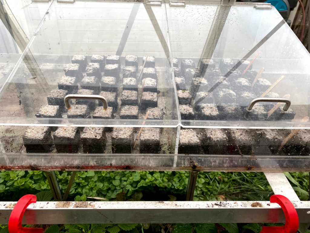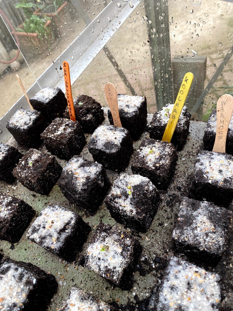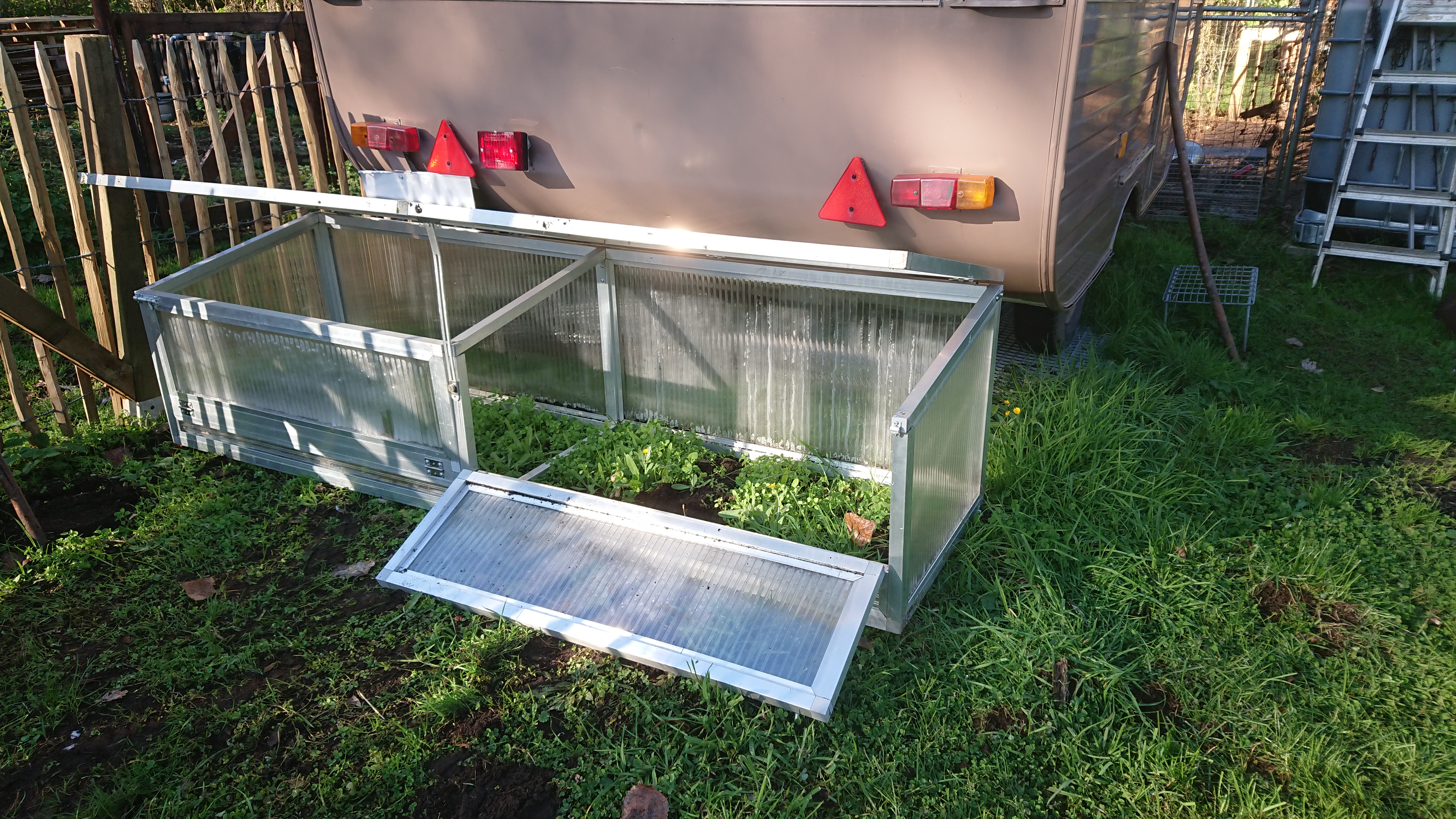 Om de klimbonen vlot te laten omhoog klimmen, gebruik ik al enkele jaren een oude serre die ik met gaas heb bekleed. Ook de pompoenen en de aardappelen worden hier gezet. Wel wissel ik ze elk jaar van kant. Tijdens de winter zaten er enkele kippen in om de grond proper te houden. Begin april gaan er dan aardappelen in de grond en in mei de klimbonen en de pompoenen. De planten staan beschut tegen de schapen- en vogelvraat. De klimbonen groeien tegen een touw omhoog en leggen zich dan op het dak. De plukrijpe bonen hangen dan juist boven mijn hoofd. Ik zet paarse en gele prinsessen, snijbonen en kievitsbonen. Van elk drie hoopjes met vijf bonen leg ik in.