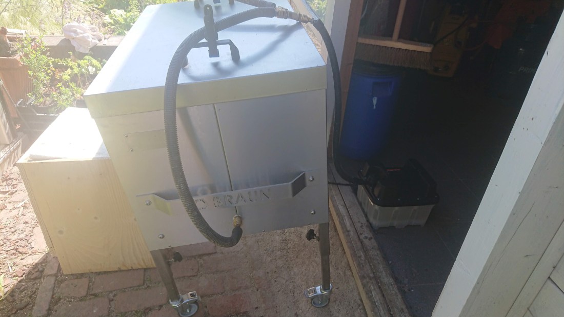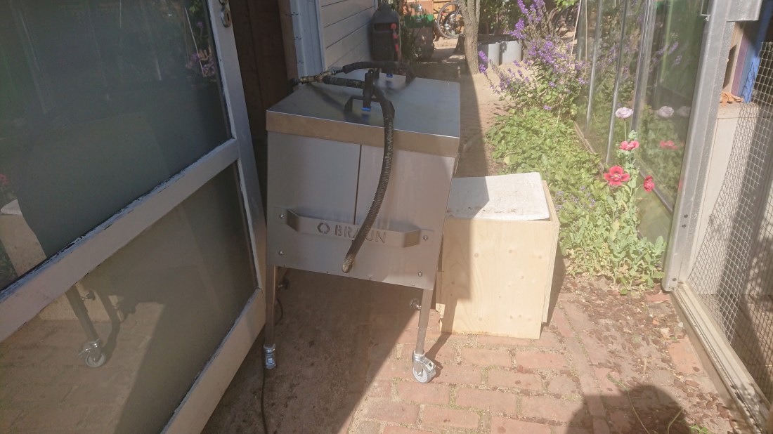 De volgende week ga ik de uitgesneden darrenraten en de ontzegelwas smelten. Deze heb ik ook tijdelijk in de vriezer bewaard. Ik heb vandaag de bijen-infodagen in Hamont bezocht en frau Braun stond daar eveneens. Ze was zeer geïnteresseerd in mijn ervaringen met haar toestel.
