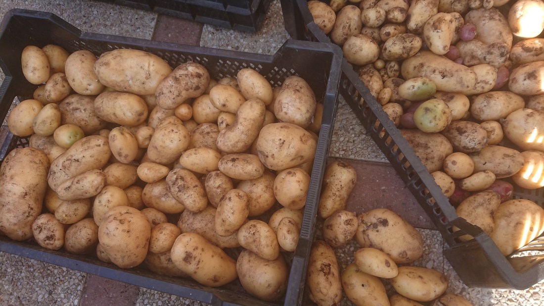 Vanavond heb ik dan samen met de kleinkinderen de eerste aardappelen geoogst. Dit jaar had ik het ras Berber gepoot en het blijken zeer grote frietaardappelen te zijn met toch een tiental stuks per plant. Op het andere bed heb ik ook nog Corne de gatte gepoot. Met deze en ook met de emmers die ik in de tuin heb neergezet, wacht ik nog enkele weken alvorens die te oogsten. Vorig jaar had ik roze en paarse aardappelen gepoot, doch was dit jaar te laat met de aankoop. Gelukkig was er nog een enkele struik uit een vergeten aardappel van vorig jaar ontstaan. Ik kan deze nu bijgevolg volgend jaar gebruiken als poters. Mijn moestuin heeft niet de ambitie om mijn gezin volledig van voedsel te voorzien. Maar enkele maaltjes van eigen gewonnen groenten is toch altijd veel leuker.