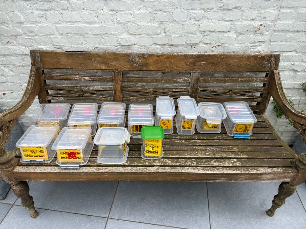 Op dit moment zitten de koninginnen in hun nest en zijn de selectieve voorjaarsvallen niet meer nodig. Daarom heb ik ze vandaag allemaal opgehaald en gereinigd. Ze kunnen nu proper worden weggezet tot volgend voorjaar.