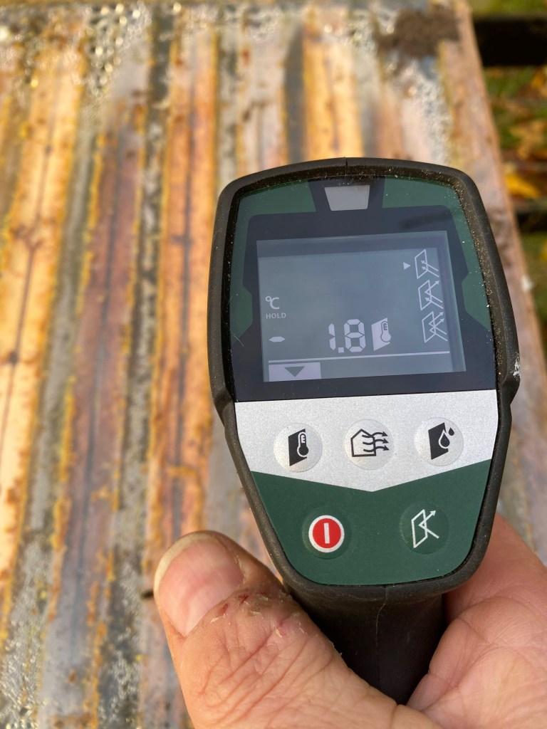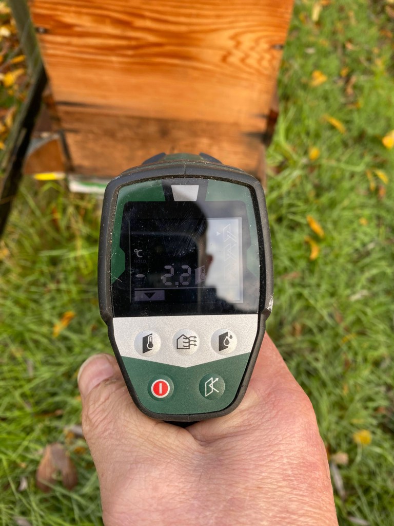 Reeds meerdere jaren controleer ik de temperatuur van de wintertros om eventueel broed vast te stellen. Met een infraroodmeter uit de bouwmarkt meet ik de temperatuur in de kasten. Eigenlijk meet ik de temperatuur boven de wintertros. Ik hou nog altijd vast aan de belangrijkste les van mijn schoonvader-imker. “Blijf uit de kast als je er niet echt moet in zijn!” En in de winter laat ik ze zeker gerust. Ik ben daarom ook geen voorstander van meetsondes in een tros bijen. Al die elektronische toestanden in de kasten hebben bijen niet nodig. Natuurlijk is meten ook weten, maar er zijn vaak niet-invasieve manieren hiervoor. Net zoals ik langs buiten het gewicht kan meten, meet ik ook langs buiten de temperatuur.