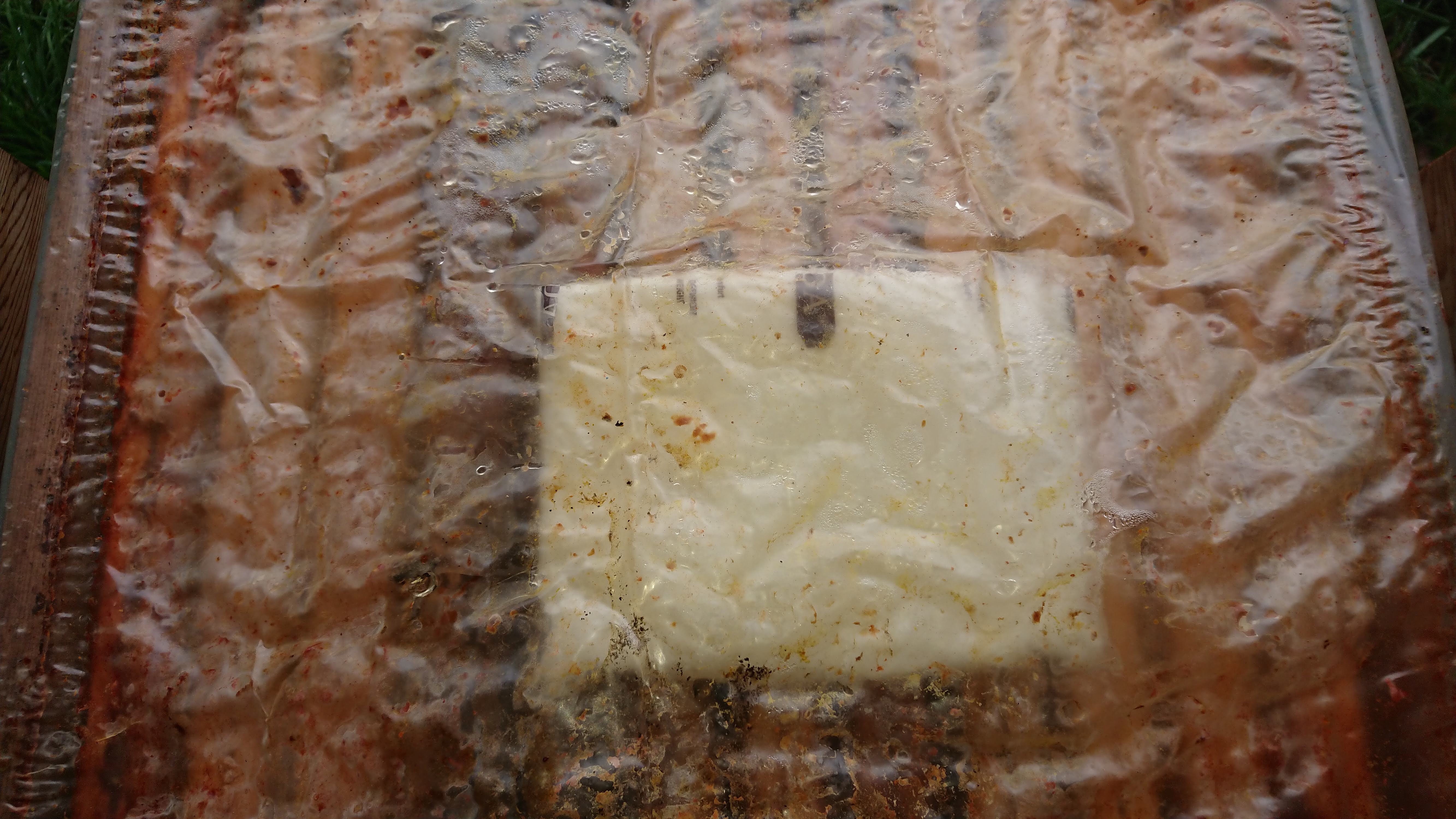 Momenteel heb ik ook alle bijenvolken een half pak deeg opgelegd. Het pak snij ik simpelweg in twee en dan hebben de bijen gemakkelijk toegang tot de suiker. De volken zijn momenteel toch een zestal kilo lichter dan andere jaren. De vele vliegdagen van het najaar hebben hun tol al opgeëist. En volgens de condensatie onder het plastic is er ook al wat broed in de meeste volken. Regelmatig zal ik nu de leeg gegeten pakken vervangen.