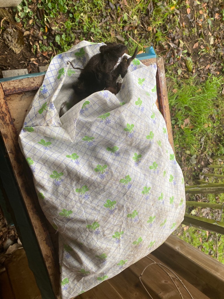 Maar ook nu bracht de dierenwereld de oplossing. Goede isolatie, lucht doorlatend en bijgevolg ademend om condens tegen te gaan. Veel vocht opnemend zonder te rotten en dit vocht daarna dan ook kunnen afgeven. Mijn schapen hadden de oplossing. Schapenwol. Vermits mijn Ouessanten elk jaar zwarte wol leveren die geen economische waarde blijkt te hebben, had ik elk jaar het probleem om hiervan af te raken. In het deksel van de Kempische kasten is deze wol echter een fantastisch isolatiemateriaal. In het begin had ik wel hetzelfde probleem als met de papiersnippers. Bij controle van het volk bleef dit materiaal niet op zijn plaats in het deksel. De oplossing lag voor de hand met oude kussenslopen. Deze heb ik gevuld met de schapenwol en passen mooi in het deksel van de Kempische kasten. De wol wordt niet aangevreten door muizen bij bewaring maar het is zelfs interessanter om jaarlijks mijn verse wol te gebruiken in plaats van die weg te gooien en de oude wol uit de kussenslopen te verwijderen.
