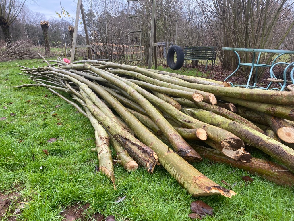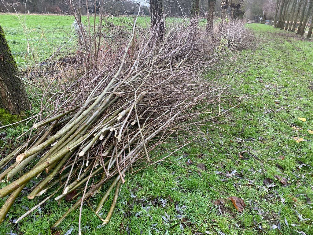 Zo blijft er steeds voldoende voedsel voor de bijen. Met de afgezaagde takken heb ik al veel geprobeerd. Ze heel dicht tegen elkaar in de grond stoppen om een levende muur te creëren of een wigwam maken door ze in een cirkel te planten en bovenaan samen te binden. Weven tussen paaltjes om een lage afsluiting te maken. Er is zeer veel mogelijk. De dikste takken zaag ik meestal in blokken. De volgende zomer kunnen die dienen om buiten te koken. Nu was ik die gisteren aan het zagen en toen merkte ik dat de onderste takken niet alleen groene blaadjes hadden maar langs de onderzijde ook stevig waren ingeworteld op die paar maanden. Het is misschien een idee om de takken die toch wel meerdere meters lang zijn, gewoon op de grond te leggen, er eventueel nog wat aarde over te gooien om een jaar later een mooie wilgenhaag te creëren.