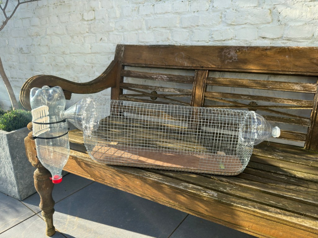 Naast de bijenstand heb ik ook nog een val geplaatst naar het model van Frank Soulat. Deze staat op een oude broedbak met enkele oude broedramen en een bakje met dezelfde lokvloeistof.