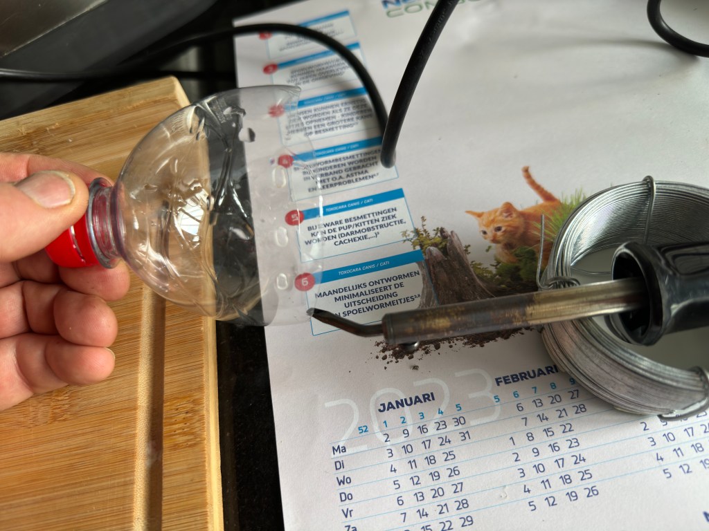 Ik begin met een draad aan een schroefje aan de buitenkant van de lat en leidt de draad langs de voorkant van de houten lat. Aan de overliggende kant heb ik de draad vastgeniet aan de binnenkant van de lat en 4cm verder door een tweede nietje terug naar onder geleidt. De tweede draad loopt er tussen met een afstand van 2 cm op dezelfde manier en bijgevolg kunnen de twee polen elkaar niet raken. De connectie met het handvat van de mepper gebeurde hier met krokodillenklemmen.