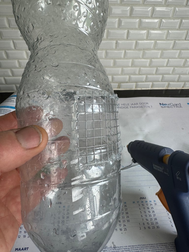 Om de bescherming nog verder te verbeteren, staan er op elke kast ook wespenvallen. Deze zijn gevuld met een oplossing die ik zelf maak van 1 liter rode wijn, 1 liter bier, 1 liter grenadinesiroop, 1/2 kg oude honing en dit aangevuld tot 10 liter met water. De vallen worden hiermee elke twee dagen opnieuw gevuld. Meestal zitten ze dan boordevol AH’s en enkele dikke zwarte vliegen.