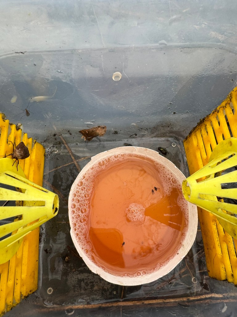 De honingbak wordt nu vervangen door een oude emmer waar ik de vis kan in leggen. Langs de zijkanten heb ik een paar gaten geboord waarlangs de AH kan binnenvliegen. Foto’s volgen nog.