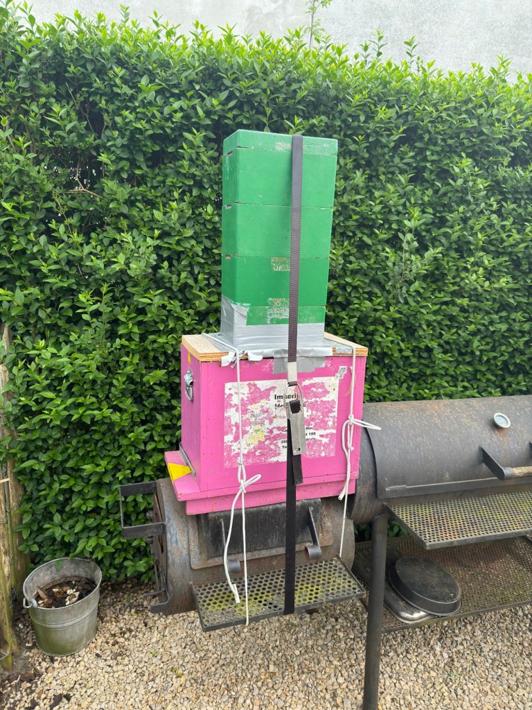 Momenteel beginnen ze weer te ‘hooveren’ voor de kasten om een volgeladen, thuiskomende bij te grijpen in de vlucht. Imkers kunnen natuurlijk met een badmintonracket voor de kasten plaatsnemen en op die manier zeer veel badmintonervaring op doen. Maar wat als we er niet zijn? Daarom heb ik momenteel voor elke kast een muilkorf gehangen. De bijen voelen zich veilig op de vliegplank en kunnen op die manier toch nog de noodzakelijke airconditioning toepassen voor het broed in de kast.