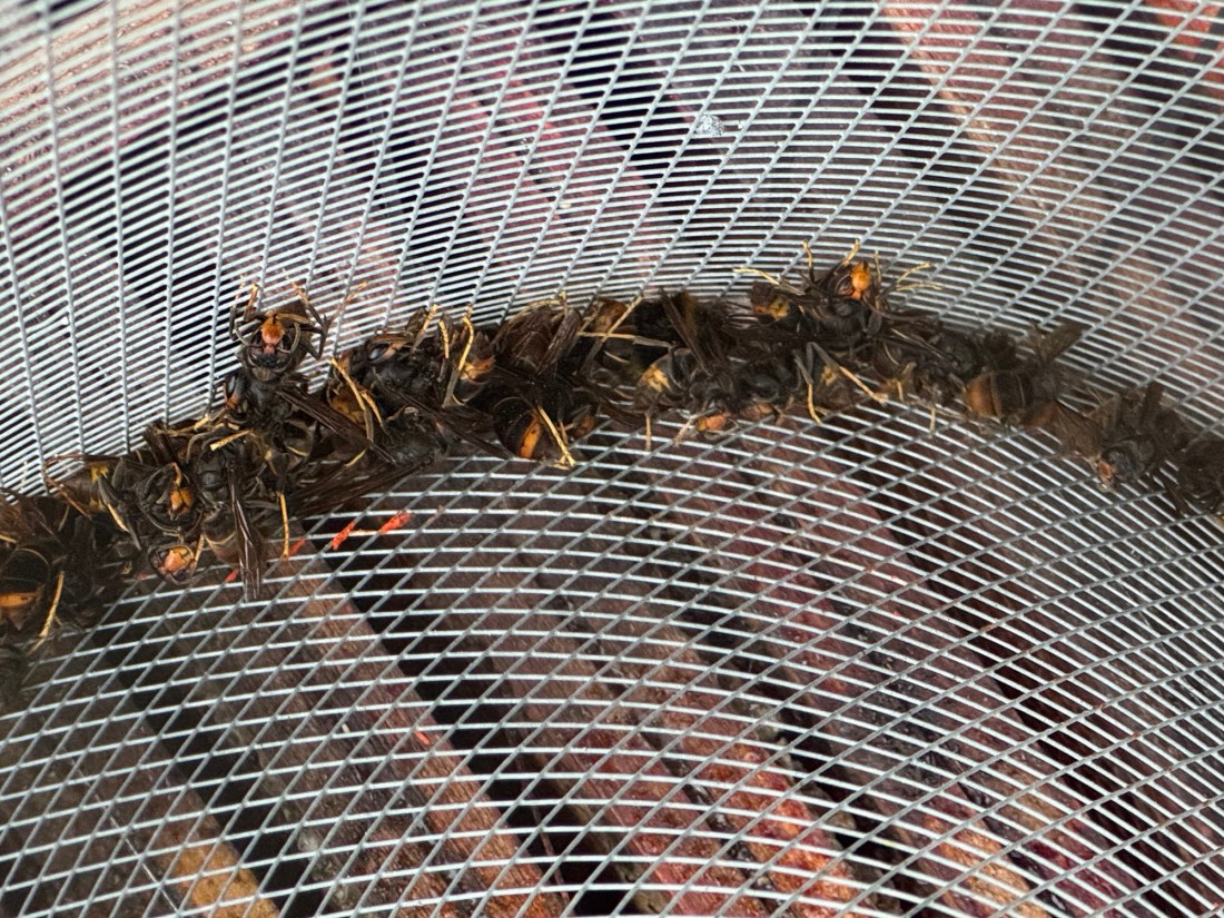 De stand aan het Waterbroek was dit jaar in tegenstelling tot 2023 bijna gevrijwaard van hoornaars. In het voorjaar heb ik twee koninginnen gevangen en daarna bleef alles rustig tot in het najaar als er af en toe eens een enkele verscheen aan de volken. De stand in Gerhagen was vorig jaar volledig vrij gebleven van de hoornaars maar dit jaar heb ik er honderden gevangen. Twaalf volken en continue tientallen hoornaars voor de kasten vanaf augustus. De selectieve val op elk dak en de muilkorf voor elk vlieggat hebben hun effect duidelijk niet gemist. De volken zijn nu in prima conditie en ik verwacht geen uitval. De uiteindelijke sterkte bij de voorjaarscontrole moet ik nog even afwachten maar naast de hoornaars hadden we natuurlijk ook nog gans 2024 dat was uitgeregend. Daarom hou ik vanaf volgende week (begin januari) de voedselvoorraad goed in de gaten.