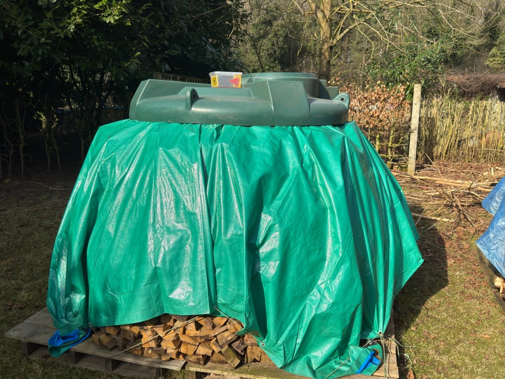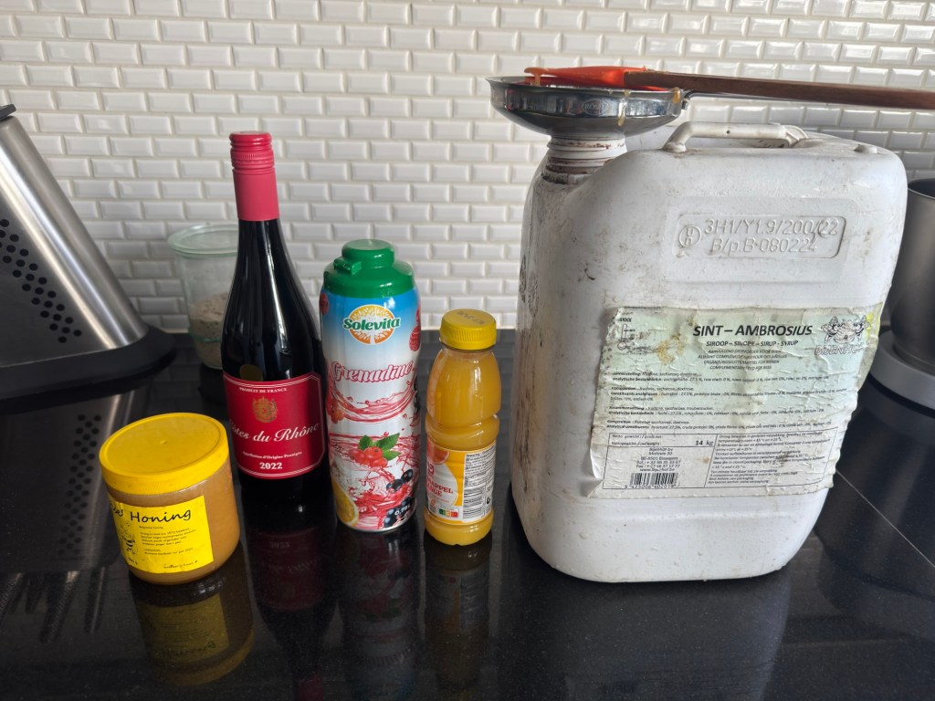 Ik gebruik als lokmiddel wijn, sinaasappelsap, limonadesiroop en een pot honing, aangevuld tot 10 liter met water.Het lokmiddel trapit gebruik ik als spray op de ingang van de vallen.Een val bovenop de houtstapel.Bovenop de reservekastenVlak bij de serre