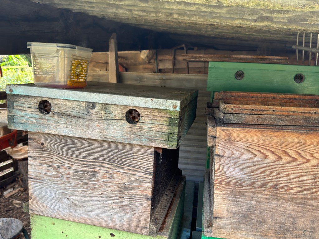 Vermits de schuiflade een beetje was uitgezet door de vochtigheid had ik mijn Leatherman nodig om ze open te krijgen.Vijf hoornaars, enkele wespen en veel rovende bijen onder het eerste volk van de rij.