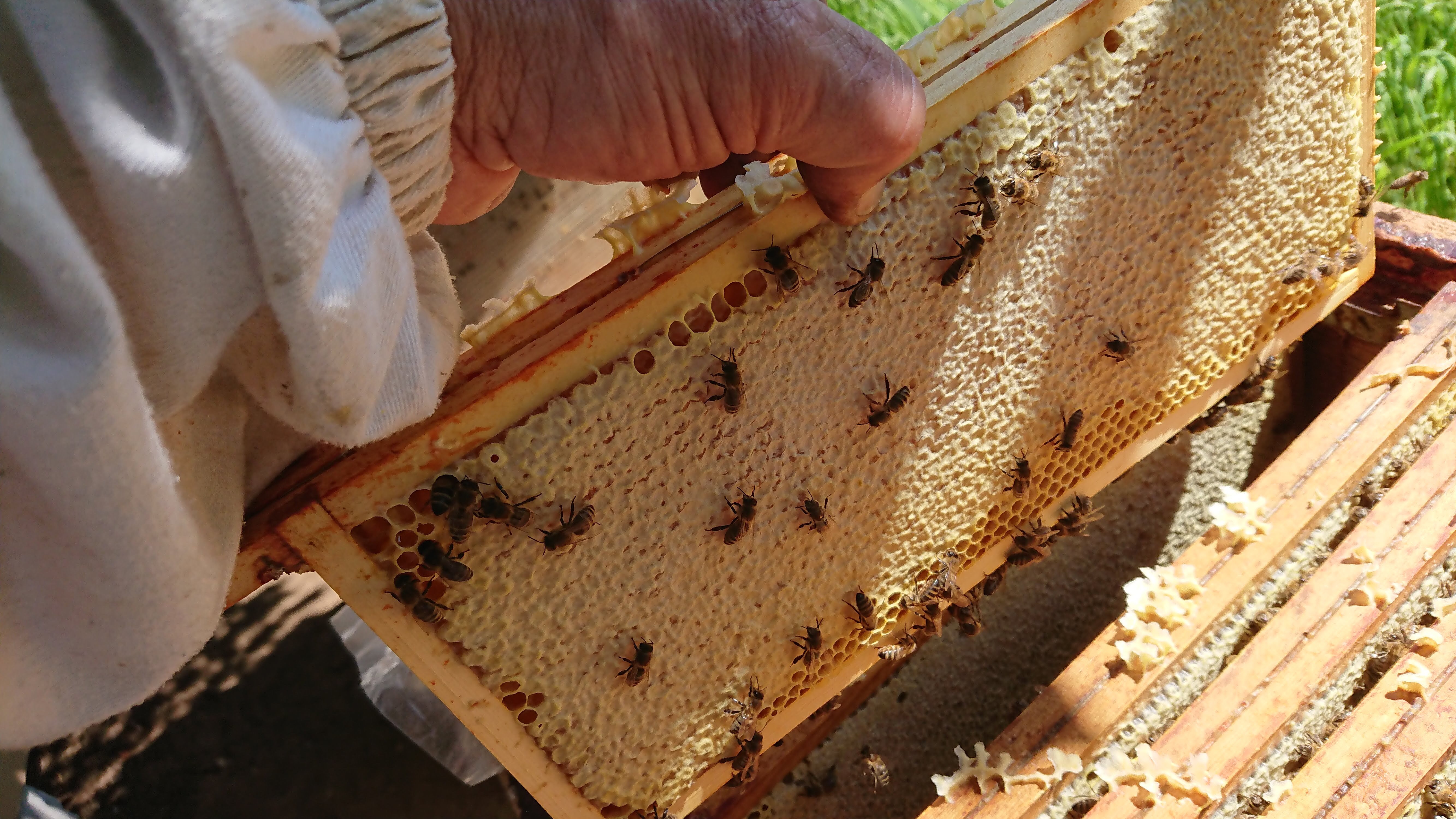 Door het slechte voorjaar, koud en nat, vlogen de bijen veel te weinig naar buiten. Slechts op één van de drie standen heb ik deze week honing afgehaald. Deze stand was dit jaar omringd door koolzaadvelden en hier was een mooie hoeveelheid honing in de honingzolders aanwezig. Ik heb van vijf kasten ongeveer 40 kg kunnen weghalen.