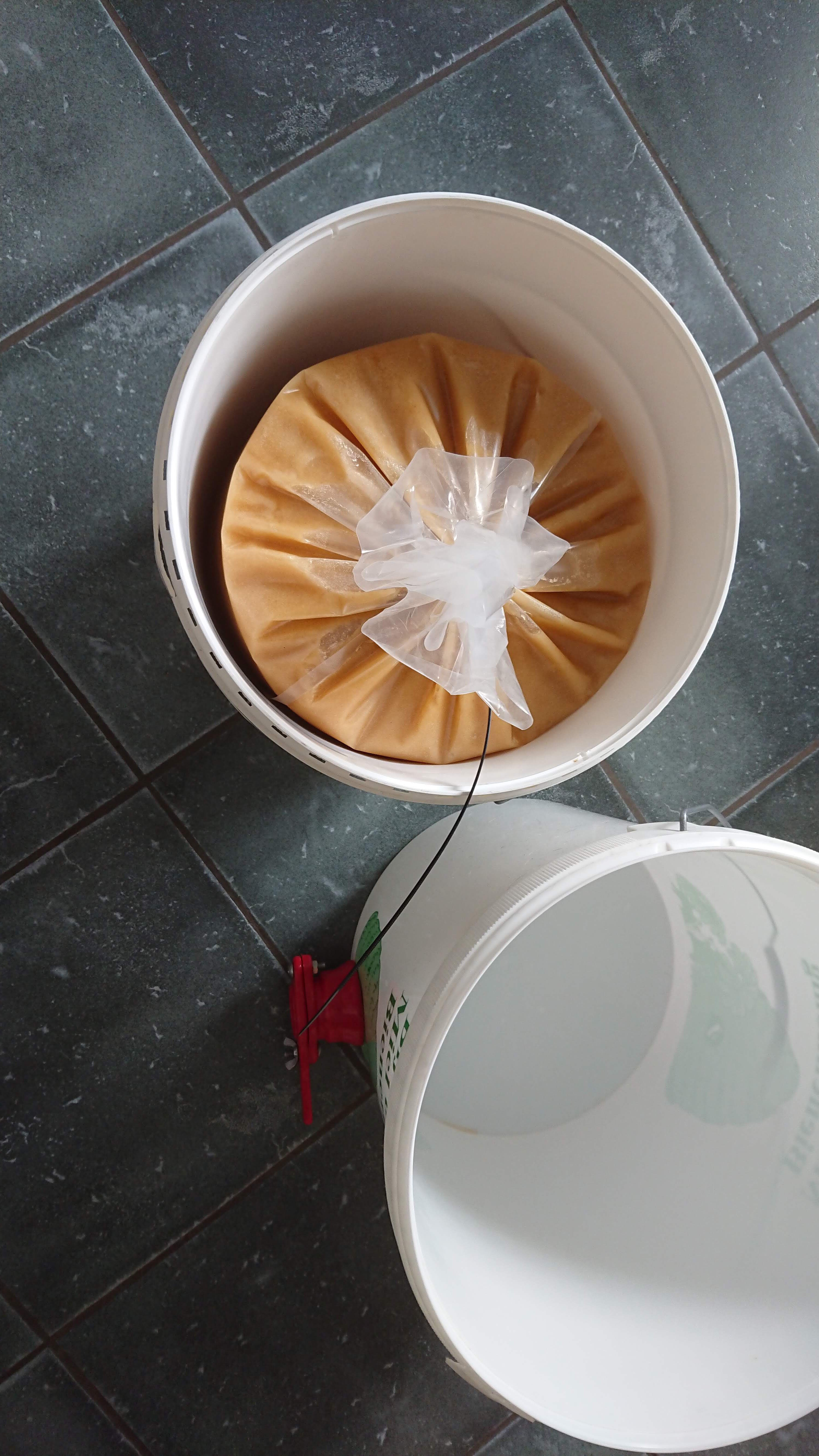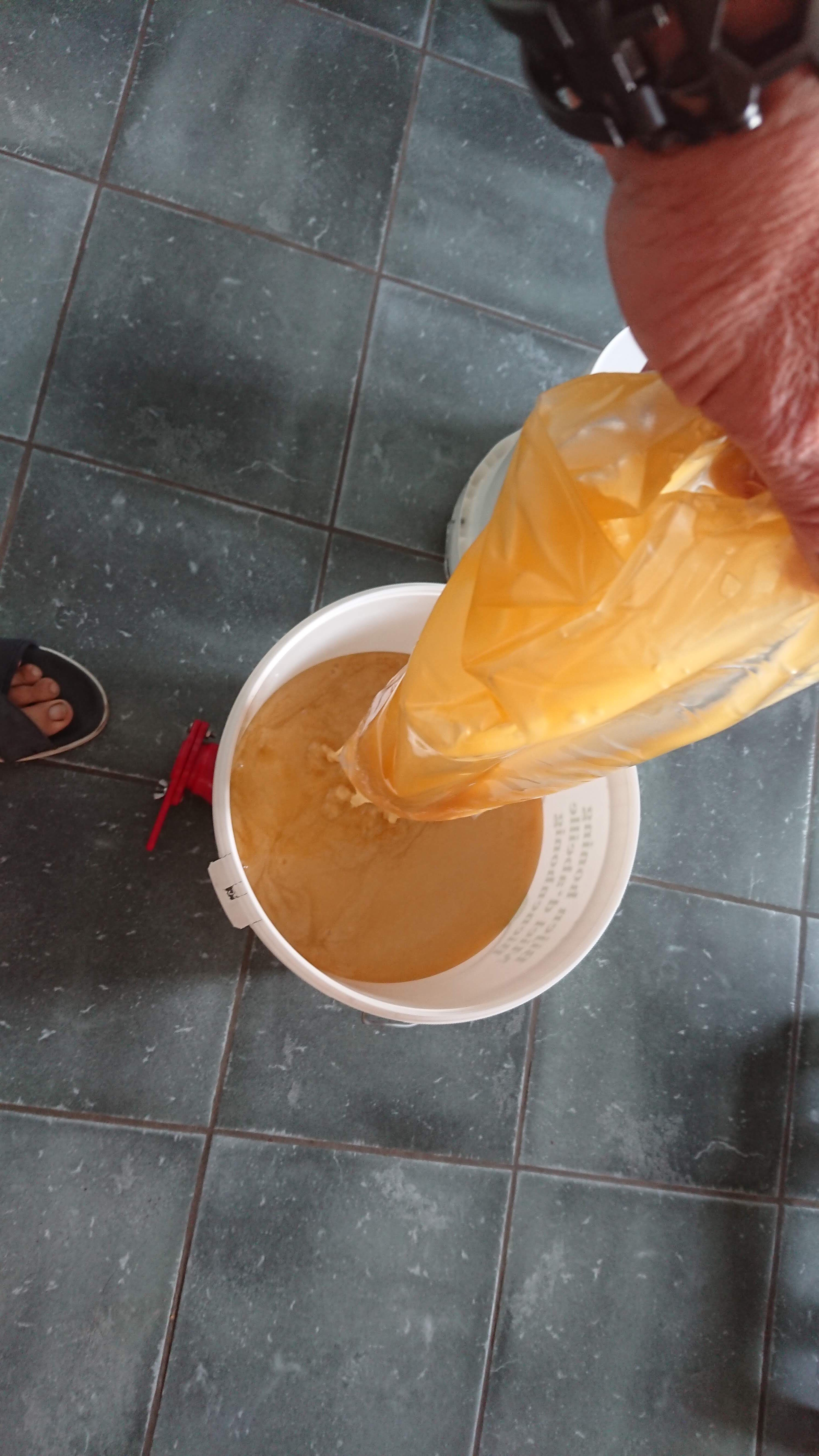 In de vaten blijft de honing dan nog twee dagen staan om te “klaren”. De kleinste onzuiverheden en de luchtbelletjes van het slingeren stijgen op en kunnen dan worden afgeschuimd. Hierna vul ik de honing in speciale voedselveilige zakken en zet ze in een afgesloten plastic emmer. Ook weer voedselveilige emmers.