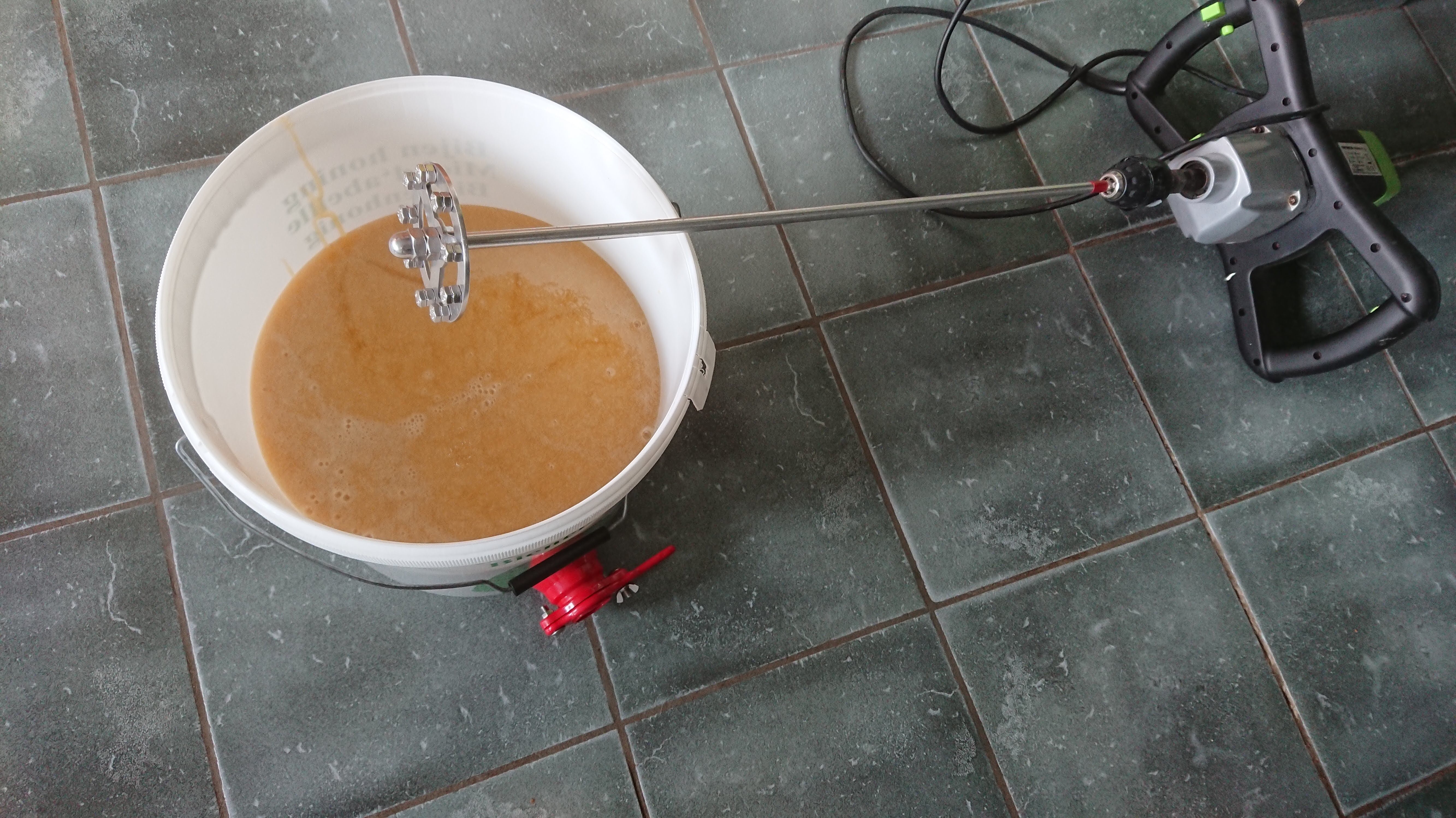 Na het zeven wordt de honing in een rijpervat gegoten. Binnen twee dagen kan ik deze honing dan afschuimen en in de roerder gieten. Tegen het volgend weekend is deze honing dan in potten.