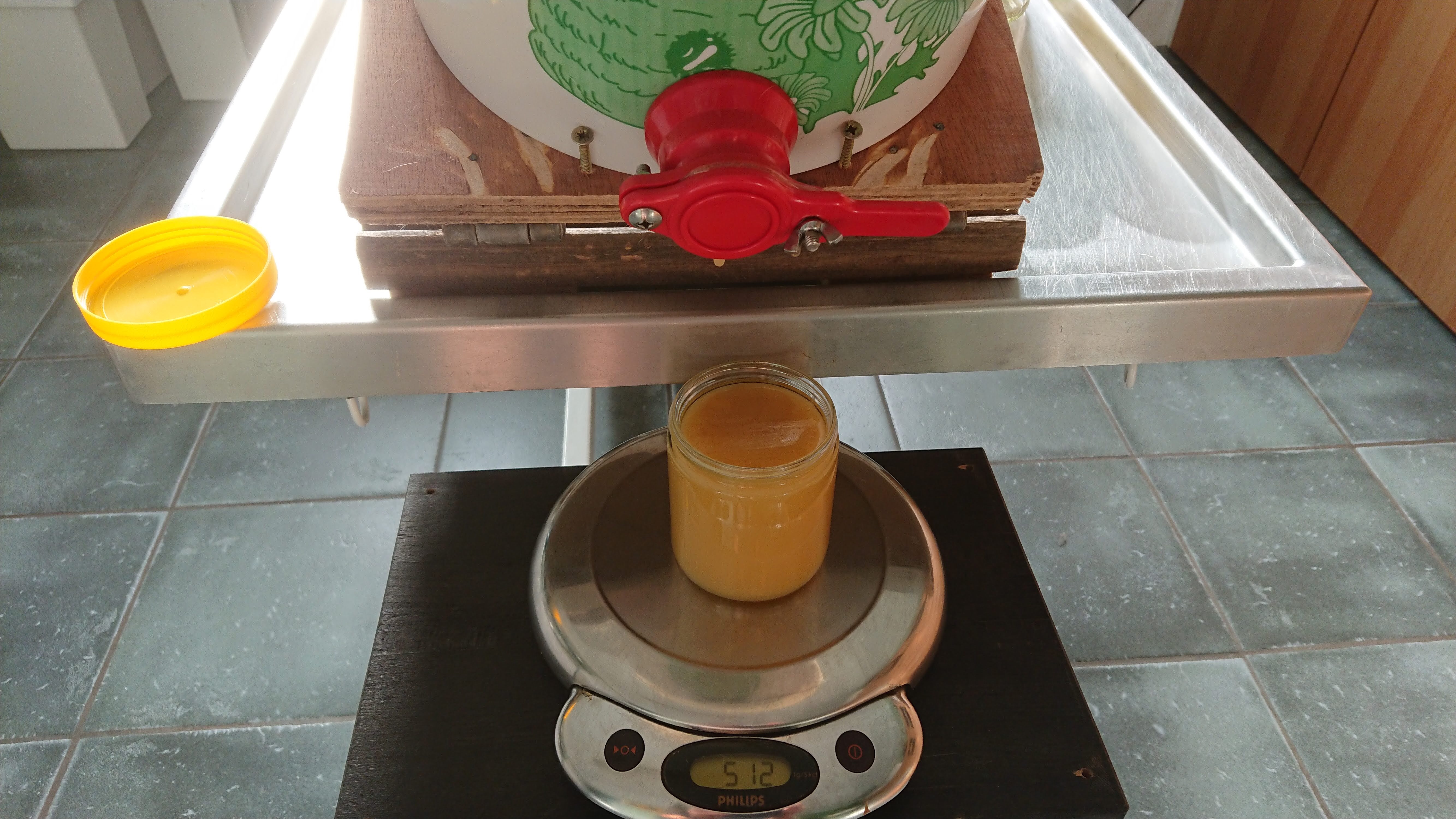 Na thuiskomst heb ik deze ramen ontzegeld en geslingerd. Een uur heb ik daarna de honing in de slinger gelaten om hem dan pas door een dubbele zeef te laten lopen. In dat uur zijn al veel onzuiverheden naar boven gestegen en dat zorgt er voor dat de zeven niet zo snel verstoppen. Die onzuiverheden komen dan pas als laatste in de zeef terecht. Die onzuiverheden zijn hoofdzakelijk stukjes ontzegelwas. Soms een stukje propolis van de ramen of een stukje bij: een pootje of een vleugeltje.
