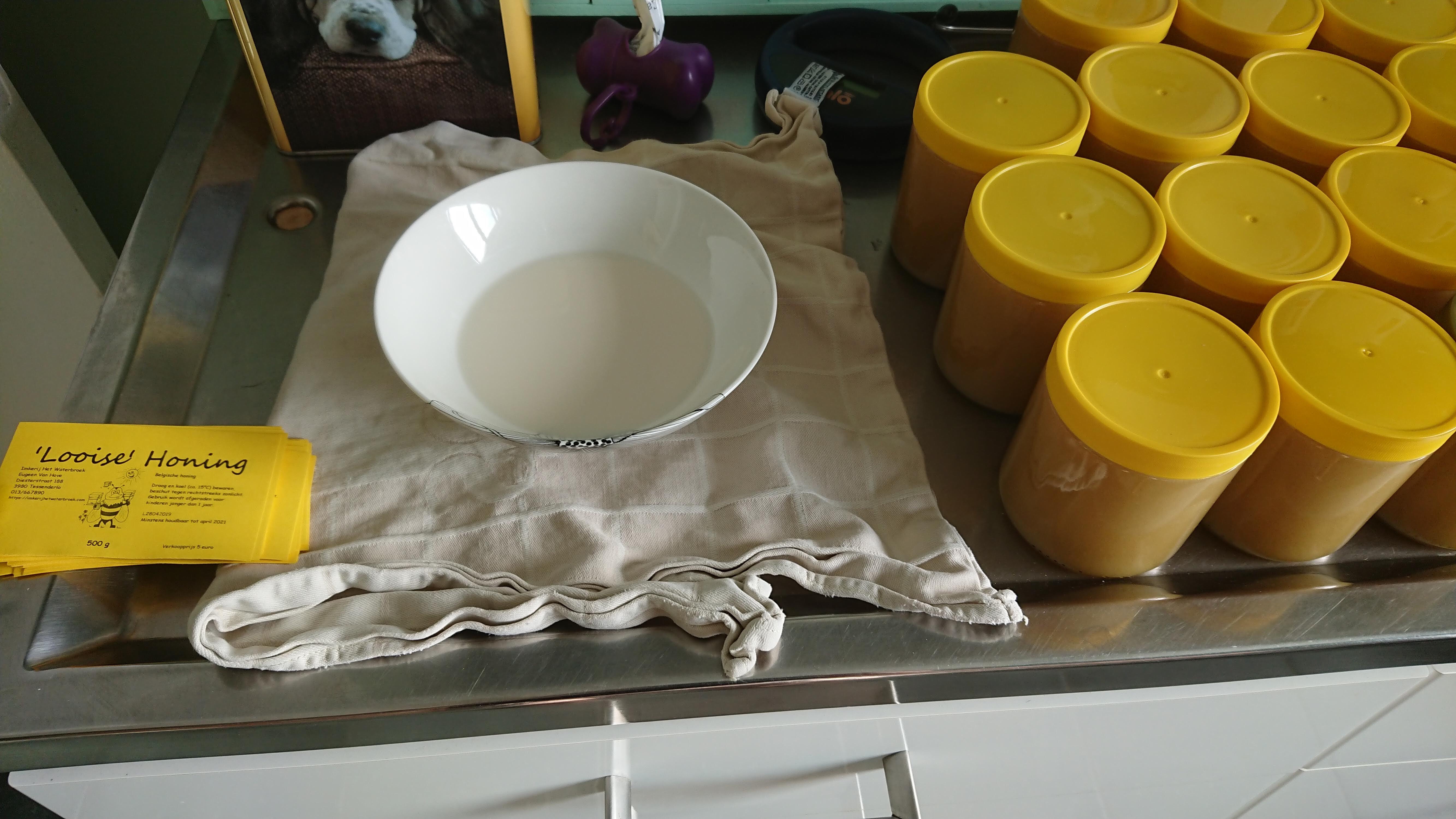 De emmers worden dan in de kelder geplaatst tot de honing wordt ingepot. Hiervoor wordt de honing terug vloeibaar gemaakt in een bain-marie op 37 graden. Na 36 uur kan ik dan de honing uit de zakken gieten in een afvulemmer. Nog eens afschuimen na 12 uur en oproeren gedurende 10 minuten. Hierna vul ik de honingpotten met deze pure honing.