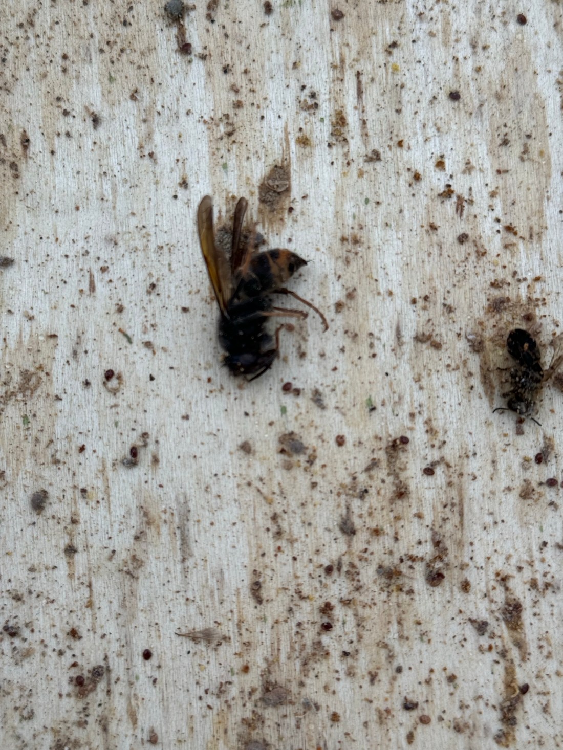 In het voorjaar heb ik enkele bodems vervangen door bodems met geïntegreerde val. Het zou de bedoeling zijn om de buitenste volken van een rij hiermee te voorzien en ongeveer om de vijf volken ertussen eveneens. In de rij van tien volken had ik er bijgevolg drie geplaatst. De verste in de rij was leeg. Er bevonden zich wel meerdere dode bijen in en meerdere wespen. Ik veronderstel dat deze hoofdzakelijk in de val terechtkwamen tijdens hun rooftocht. Want ook tegen rovende bijen zou deze val helpen. De middelste bodem bevatte toch ook een Aziatische hoornaar. Maar de eerste bodem aan het begin van de rij bevatte vijf hoornaars. De valbodems blijken dus toch te werken. Ik maak alleen maar de bedenking dat ze te duur zijn voor een constructie in dun triplex. Ik kan alleen maar hopen dat ze enkele seizoenen kunnen gebruikt worden.