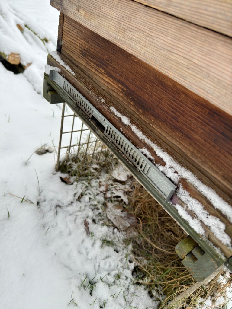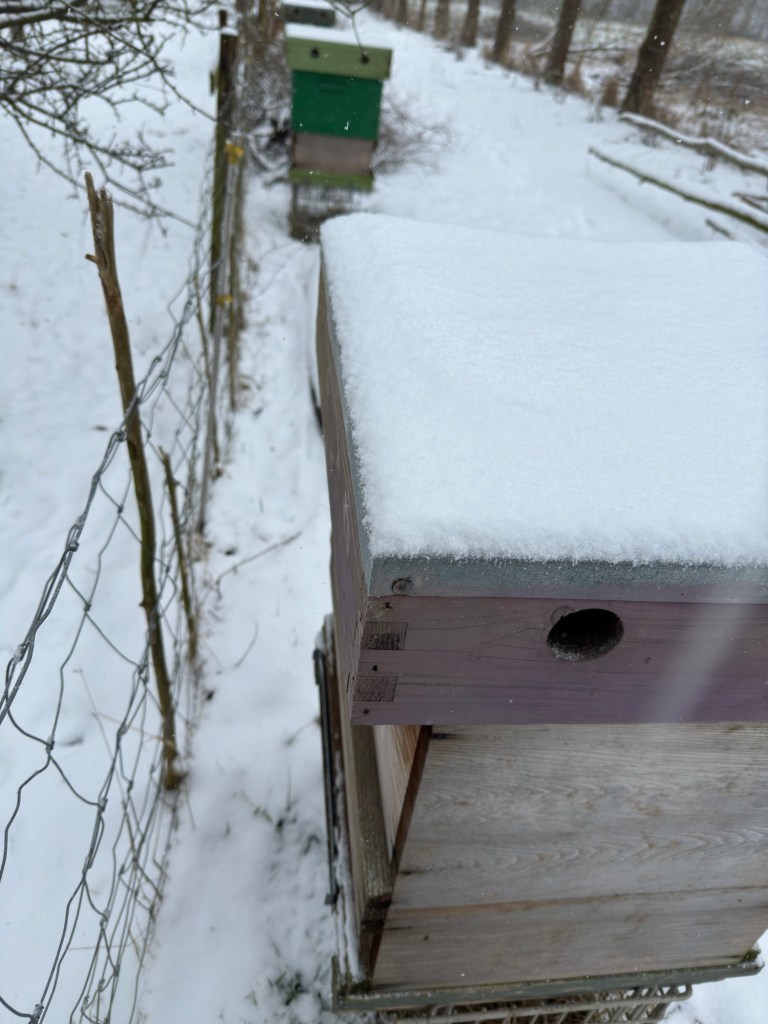 Ik heb nog een voordeel ontdekt aan het verwijderen van de vliegplank. Of in elk geval een zorg minder. Sneeuw op de vliegplank. Verwijderen of niet. Als ze er niet is, is de vraag niet meer aan de orde. Op de eerste foto was de sneeuw al bijna gesmolten. Op de tweede foto, na de tweede winterprik, is de vliegopening nooit dicht geweest.